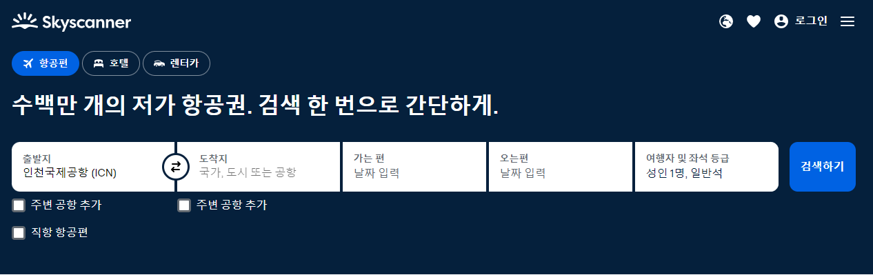 스카이스캐너는 단일 웹사이트에서 출발지와 목적지, 날짜를 입력하면 여러 항공사의 항공권 가격을 즉시 비교해 보여줍니다.