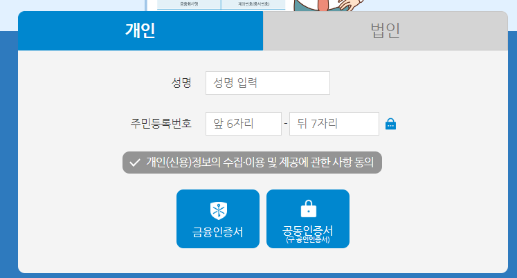 공인인증서 로그인: 공인인증서를 사용해 로그인합니다.