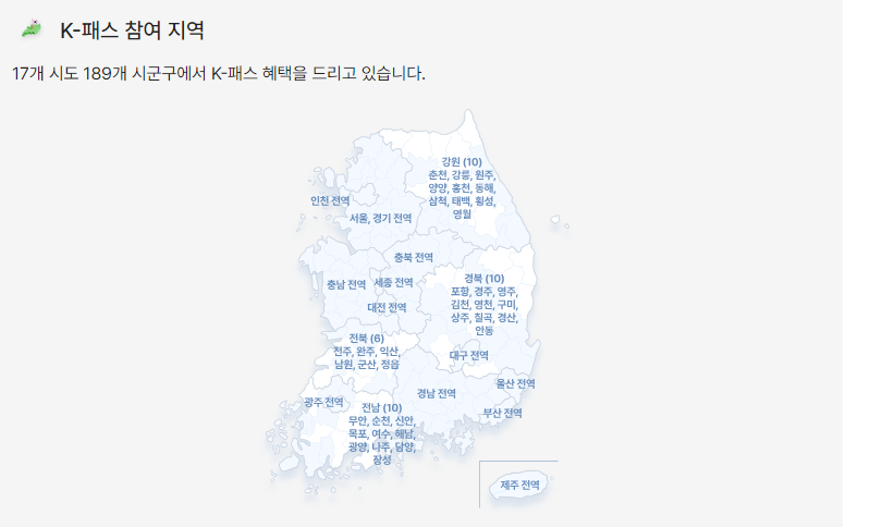 지역별 추가 혜택은 K패스 카드는 전국 17개 시도 189개 시군구에서 사용할 수 있습니다. 특히 경기도와 인천시는 무제한 적립 혜택을 제공합니다.